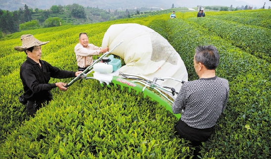4月17日,松阳上安茶业专业合作社社员采用采茶机作业,以缓解春季采茶工短缺的矛盾。一台采茶机一天能采十几亩茶地。