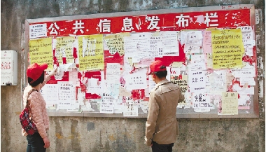 两名志愿者发现了一块混乱的公共信息发布栏。通讯员 沈甜 摄