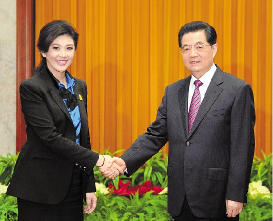 4月18日,国家主席胡锦涛在北京人民大会堂会见泰国总理英拉。 新华社记者 李涛 摄