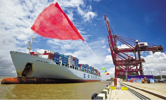 一艘集装箱货轮靠泊在舟山大浦口集装箱码头。作为宁波—舟山港一体化的重要港口,大浦口集装箱码头发展迅猛。该码头今年首季度已实现集装箱吞吐量83170标准箱,同比增长355.4%。 陈炳群 涵佳 摄