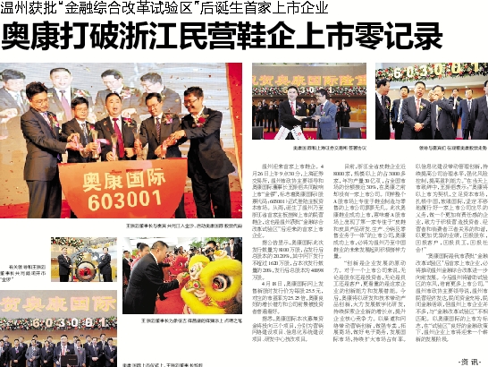 温州迎来首家上市鞋企。4月26日上午9点30分,上海证券交易所,温州市政协主要领导和奥康国际董事长王振滔共同敲响上市“金锣”,标志着奥康国际(股票代码:603001)正式登陆主板资本市场。从而,诞生了温州乃至浙江省首家主板挂牌上市的民营鞋企,这也是温州获批“金融综合改革试验区”后迎来的首家上市企业。