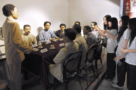 参观者在广州中共三大会址纪念馆内观看中共三大会议场景蜡像。 新华社发