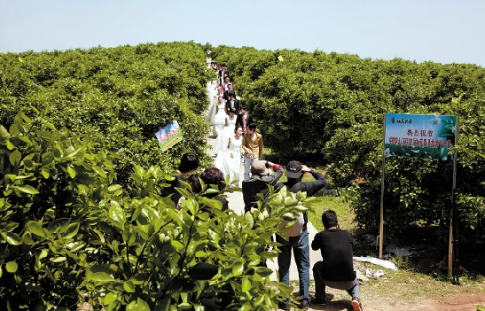 4月26日,首届中国常山(同弓)文化旅游节在常山县同弓乡太公山胡柚基地开幕。胡柚是常山特产,全县种植面积超过10万亩。图为新人们在胡柚园里拍摄婚纱照。