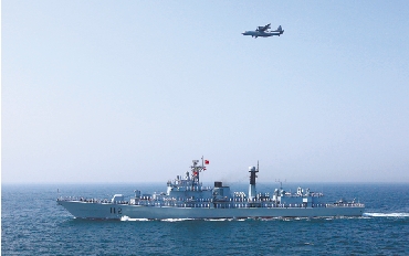 4月26日,“哈尔滨”号导弹驱逐舰与中国海军航空兵“空警—200”飞机一起接受检阅。 新华社记者 查春明 摄