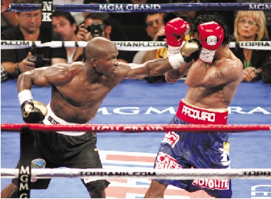 9日,在美国拉斯韦加斯举行的WBO次中量级拳王争霸赛中,世界拳击组织(WBO)超轻量级拳王、美国人布拉德利击败八条金腰带拥有者、菲律宾拳王帕奎奥,结束对手15连胜。图为布拉德利(左)在比赛中。 新华社发