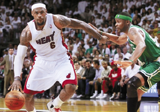 热火队球员詹姆斯(左)带球进攻。新华社发