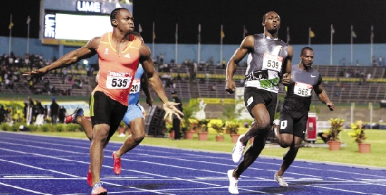 6月29日,在金斯敦进行的牙买加田径奥运选拔赛男子100米决赛中,约翰·布莱克(左一)以9秒75的成绩获得冠军,博尔特(中)以0.11秒之差获得亚军。 新华社发