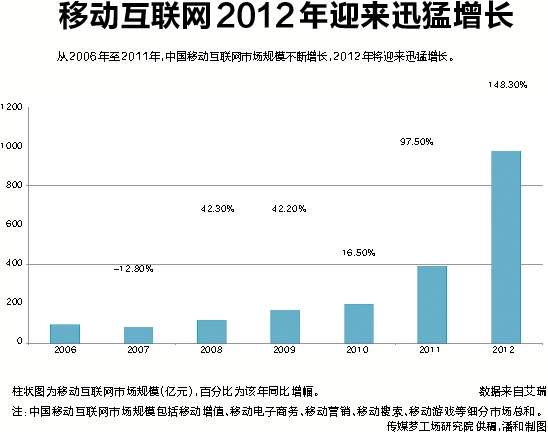 从2006年至2011年,中国移动互联网市场规模不断增长,2012年将迎来迅猛增长。