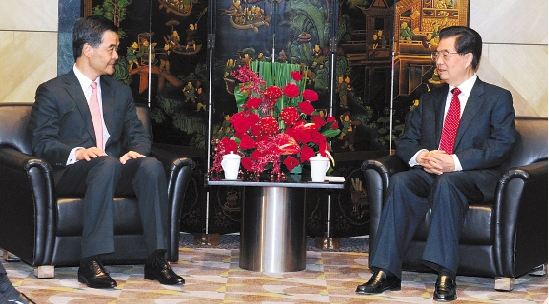 7月1日,胡锦涛在香港会见香港特别行政区第四任行政长官梁振英。 新华社记者 王晔 摄