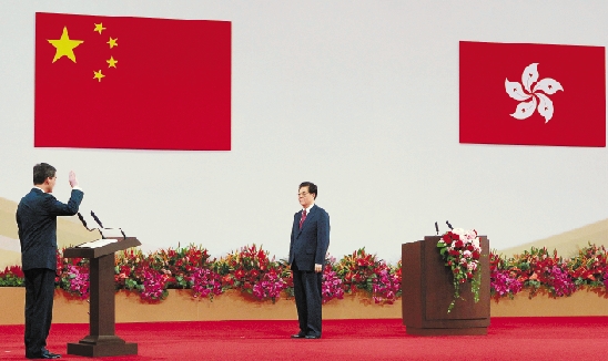 7月1日,由胡锦涛监誓,香港特别行政区第四任行政长官梁振英宣誓就职。 新华社记者 鞠鹏 摄
