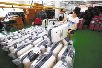 浙江鸿一箱包有限公司推出的新型纯PC材质箱包,在广交会上受到外商追捧。目前,公司已签下百万只的出口生产订单。 庄颖昶 摄