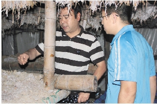 记者于洪海在遂昌银都村潮湿的蘑菇大棚里采访。江晨 摄