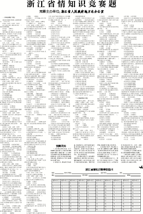 2.答题方法:请选择正确答案,按选题序号,将正确的答案用蓝、黑水笔在答题卡中相对应“○”涂满即可。答题卡可以自行复印,也可从“浙江在线·浙江地方志”网站下载,但身份证号码相同的答卷只以一张为有效答卷。
