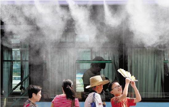7月2日,杭州公交灵隐站,乘客们在喷雾下等候公交车,清凉了一把。该公交站早上8点就开启喷淋降温系统。据介绍,喷雾的水质相当于纯净水,喷到的范围内,能有效地将气温降低5℃以上。 本报记者 吴煌 实习生 斯旭诚 摄