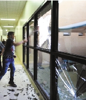 7月1日,位于利比亚第二大城市班加西的利比亚最高选举委员会办公大楼遭遇袭击,有数人受伤,但尚无人员死亡的消息。图为抗议者砸破最高选举委员会办公大楼的窗户。