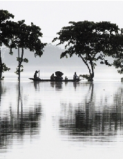 6月29日,在印度阿萨姆邦,人们乘坐木筏在洪水中行进。由季风引起的洪灾已经造成印度阿萨姆邦27人死亡,100多万人口流离失所。 新华社发