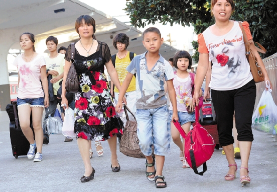 7月2日,杭州火车南站出口处,贵州、湖南、重庆等地的“小候鸟”来到杭州与打工的父母团聚。