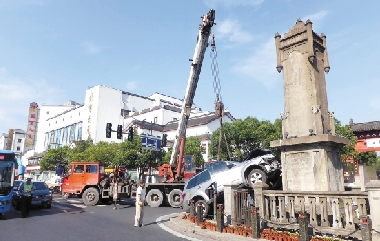 7月2日清晨,绍兴市一辆银色汽车撞上了秋瑾纪念碑。 王志成 摄