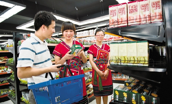 7月2日,象山县石浦台湾商贸城里的营业员向顾客介绍台湾特色美食。这家将于7月4日营业的商贸城,是我省首家直销台湾商品的购物城。 李震宇 白植槟 陈光曙 摄