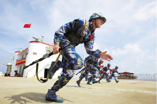 图为我驻守南沙赤瓜礁的海军战士在礁堡上进行军事训练(资料照片)。 新华社记者 查春明 摄