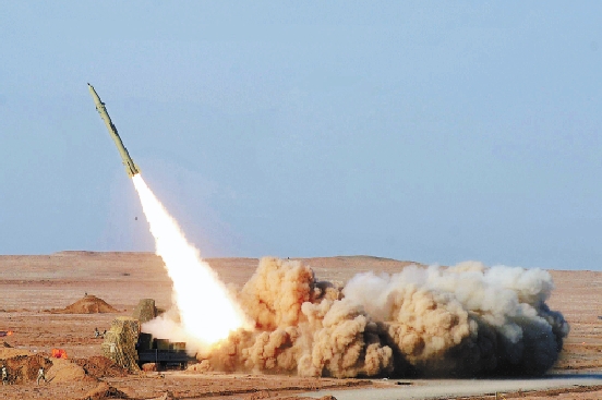 这张7月3日从伊朗ISNA通讯社获得的照片显示,伊朗军队在演习中发射一枚“征服者”战术导弹。欧洲联盟对伊朗的石油禁运7月1日生效。伊朗军方官员同日宣布,伊斯兰革命卫队自2日开始进行为期3天的军事演习,投入弹道导弹攻击沙漠目标。 新华社发