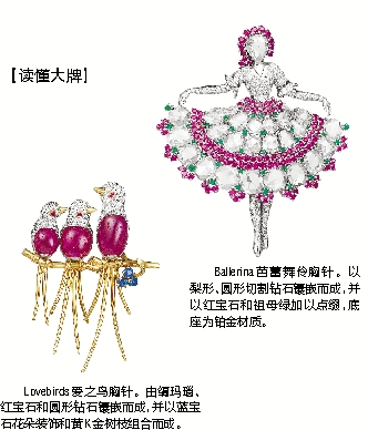 Ballerina芭蕾舞伶胸针。以梨形、圆形切割钻石镶嵌而成,并以红宝石和祖母绿加以点缀,底座为铂金材质。