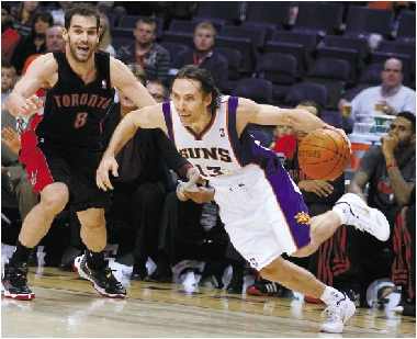 | 7月5日,美国多家媒体透露,菲尼克斯太阳队球员纳什以先签后换的方式被交易至洛杉矶湖人队,目前交易已经完成。下赛季,这位两届“最有价值球员”(MVP)将携手科比共同为湖人队效力。图为纳什(右)在比赛中带球突破。 新华社发 |