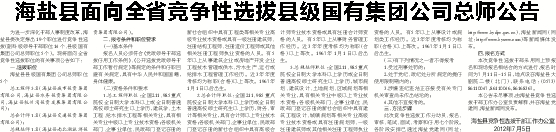 海盐县面向全省竞争性选拔县级国有集团公司总师公告