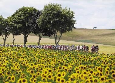 7日,在2012年环法自行车赛第七赛段中,英国天空车队的英国车手弗鲁姆以4小时58分35秒的成绩获得冠军,他的队友威金斯获得黄色领骑衫。图为选手在比赛中经过一片向日葵田。 新华社发