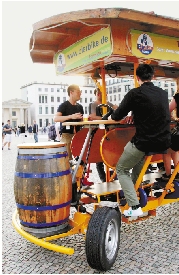 7月7日,一辆“啤酒自行车”停在柏林市中心勃兰登堡门前广场上,游客在车上畅饮。身兼自行车与酒吧功能的“啤酒自行车”在德国许多城市的街头不时可见,它最多可容纳16人围坐在一起,一边脚蹬踏板前行,一边畅饮啤酒。 新华社记者 潘旭 摄