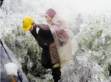 这是2008年2月3日,营救人员将因冰冻灾害受困的80岁老人陈章德背出江西省龙南县金莲村。 新华社发(资料照片)