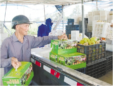 温岭市城南镇国家梨产业技术体系大棚梨示范园内,员工正将刚采下的大棚翠冠梨装车出运。今年大棚翠冠梨开始陆续上市,亩产达1800多公斤,每公斤售价12元左右。 通讯员 葛云丹 摄