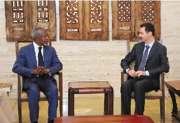 7月9日,在叙利亚首都大马士革,叙利亚总统巴沙尔·阿萨德(右)会见联合国-阿盟叙利亚问题联合特使安南。 新华社发