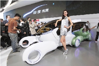 4月23日,在北京国际车展媒体日上,根据仿生学设计的奇瑞新能源概念车“@ant”亮相,其外形类似蚂蚁,整车将新能源、互联网、云计算和物联网完美结合。 新华社发(罗伟 摄)