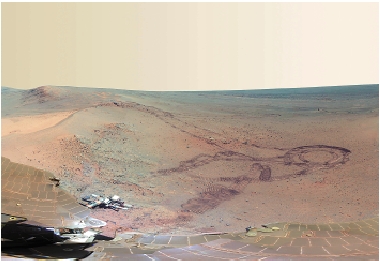 这是美国宇航局7月8日公布的火星表面高清全景图。 这张全景图由美国火星探测器“机遇”号桅杆上的全景相机用了4个月时间拍摄的817张照片拼接而成。画面中展现了“机遇”号的运动轨迹和一个陨石坑,还包括了“机遇”号的太阳能板和甲板。 新华社发 |