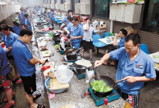 昨天中午11点多,温岭市城北街道台州飞鹰鞋业有限公司的集体厨房内,百余名员工开始在500多平方米的集体厨房里开锅做饭,厨房内设有煤气灶、电磁炉,并摆放了吃饭所用的桌椅。
