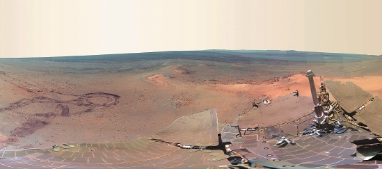美国宇航局(NASA)公布了由“机遇号”火星车拍摄的火星表面高清广角照片。照片中可以清楚地看到“机遇号”附近的一个巨大陨石坑以及土壤细节。根据计划,美国宇航局的下一代火星车“好奇号”将于今年8月登陆火星,接替“机遇号”。 视野网供图