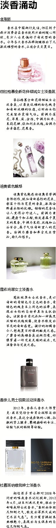 香水在中国渐行走俏,但区别于西方消费者在香水使用方面的随心所欲,东方人士更偏好于清淡型的香水。今年各大香水品牌相继推出了几款淡雅型的香水,正适合炎炎夏日。