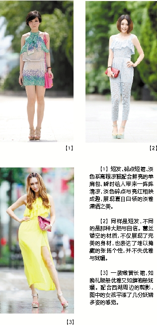 【1】 短发、碎点短裙、淡色系高跟凉鞋配合鲜亮的单肩包,瞬时给人带来一阵阵清凉,淡色碎点与亮红相映成趣,展现夏日白领的淡雅潇洒之美。