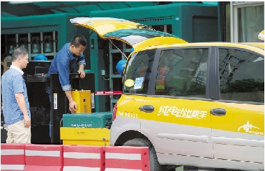 7月12日,杭州黄姑山路充换电站,工作人员正在给一辆电动出租车更换电池。杭州已累计建设62座充换电站和配送站、5座充电站、620个交流充电桩。到2012年年底,杭州市区可达到平均每座充换电站的服务半径为5公里的目标。