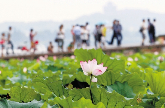 7月12日,杭州西湖接天荷叶此起彼伏,荷花盛放,蔚为壮观,游客赏荷正当时。 本报记者 吴煌 摄