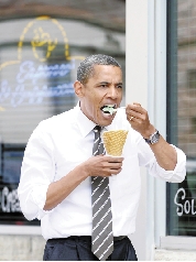 7月10日,在美国艾奥瓦州锡达拉皮兹,美国总统奥巴马在一家冰激凌店吃薄荷巧克力口味的冰激凌。