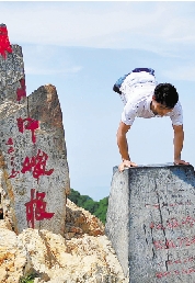 7月12日,来自山东苍山的“无腿铁臂汉”陈州历经7小时艰苦攀登,仅凭两个方形小木箱和双臂登上了海拔1491.73米的中岳嵩山峻极峰,完成了攀登“五岳”计划中的第二座著名山峰。图为陈州在嵩山峻极峰顶庆祝。