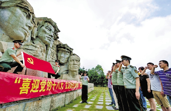 6月28日,福建省长乐市梅花边防派出所党支部和梅花镇梅新村党支部新老党员在长乐地下党革命烈士塑像前宣誓。 新华社记者 张国俊 摄