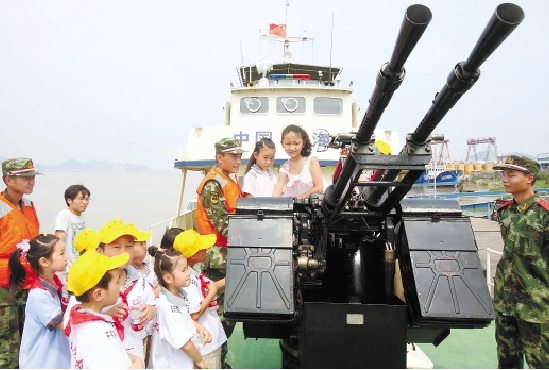 7月12日,台州市黄岩区三友学校的外来务工人员子女来到市爱国主义教育基地——浙江海警第一支队警营,参观海警巡逻艇。 牟永选 摄