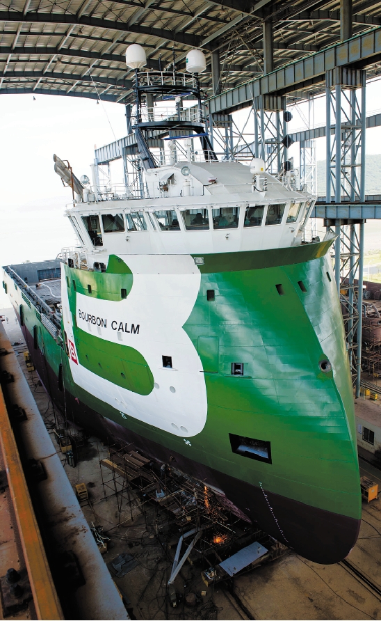 7月4日,浙江造船有限公司生产平台上,一艘为法国一家企业建造的4400吨的海上平台供应船主体已现。浙江造船公司通过转型升级及节能降耗,苦练内功,增强竞争力,订单已排到2013年。目前,该公司已成为全球最大的OSV(海洋石油辅助船)制造商。