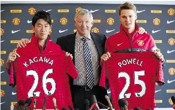 7月12日,在曼彻斯特老特拉福德球场举行的新闻发布会上,来自德甲多特蒙德队的香川真司(左)和英甲克鲁队的18岁小将鲍威尔(右)正式宣布在下赛季加盟曼联队。 新华社发