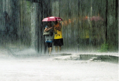 7月13日,武汉市江岸区,两名行人站在雨中。当日,湖北省武汉市遭受大暴雨袭击,城区多处地段严重积水,被网友戏称为“城区可‘看海’。” 新华社发