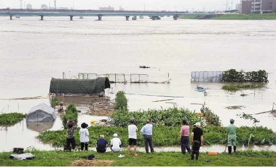 7月14日凌晨,日本九州北部地区再次遭遇特大暴雨。目前九州地区约24万居民被要求撤离所在地。自7月11日起九州北部连降暴雨、河水泛滥、引发泥石流及山体滑坡等灾害,迄今已造成20人死亡、8人失踪。图为在九州岛佐贺县鸟栖市,当地居民观望被洪水淹没的菜地。 新华社发 |