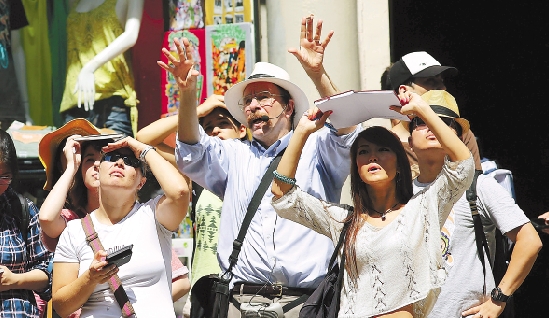 7月6日,一群游客顶着烈日在美国纽约百老汇游玩。 新华社发